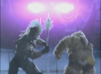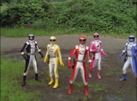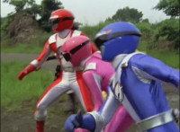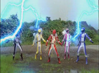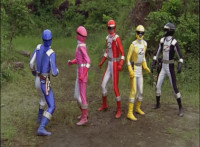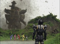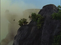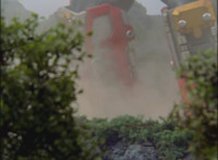 The Rangers look upward to our left, glancing at one another and consulting their Overdrive Trackers. Close on Red talking and gesturing, before all five race down a dirt road. Suddenly, an earthquake occurs, so they pause, then follow Red as he leads them off to our left. Flurious' Robot is digging in the side of a mountain. The Rangers reach a clearing and watch, Red talking, before suddenly all five get zapped by electricity, causing them to spark burst and collapse to their knees. Each of the Rangers gets a quick reaction beat while smoking and recovering, zoom out as Mig lands before them, taunting them. The Rangers slowly rise back up as Red talks, Mig replies, then zoom out as Flurious' Robot's eyes light up, and it begins to spin around in place, drilling into the ground and quaking the place, Rangers included. |