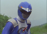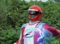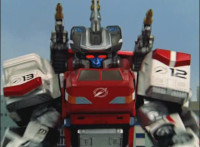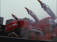 Mercury hits the brakes, Firetruck Zord parks, extends out its side stabilzer, then raises its hoses. Zoom in as Mercury speaks, before the hoses start spewing water forth. |