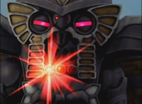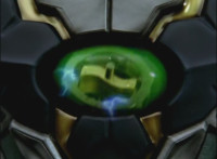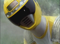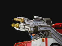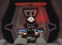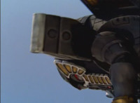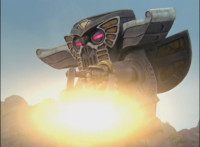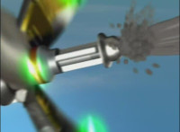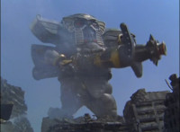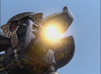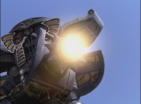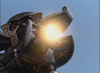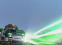 As the area quakes, Mig turns around and witnesses Flurious' Robot spinning as it emerges from underground, now armed with a giant bazooka or cannon. Mig speaks, before leaping up. Flurious' Robot poses with its new weapon. Pink consults her Overdrive Tracker, and scans the cannon, talking to her teammates about her findings. The cannone is held close to the Robot, as Mig joins Benglo in the cockpit, before firing the bazooka forth. The yellow energy bolt flies over the Rangers and explodes a mountain range in the distance, but quakes their area. The Rangers react, zoom in on Red responding. |