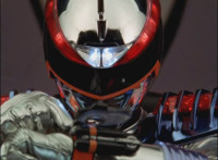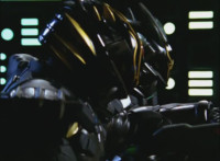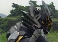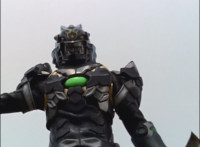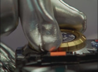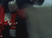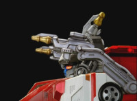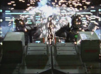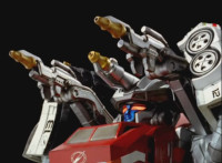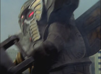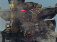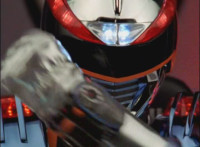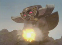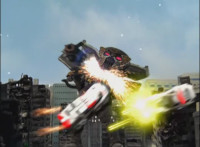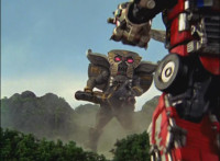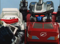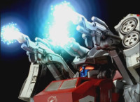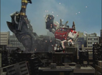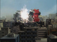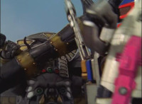 Flurious' Robot turns to see DriveMax Megazord marching right at it, slashing its saber forth, which the Robot blocks with the bazooka, before butting it sparkily into the Megazord until it drops its blade. Flurious' Robot then sparkily bazooka bops DriveMax in the chest, sending it sliding back. In the cockpit, the Rangers talk as they react, then zoom in on Red nod-talking forth. Flurious' Robot flashes its trio of gems, causing explosions to erupt upon DriveMax, jolting the Rangers within. The Megazord falls to its knees, as we zoom into Flurious' Robot, where we see Mig & Benglo, their chest gyros spinning, which then charge up the Robot's own gyro in its gut, firing off a burst of golden energy forth. |