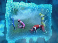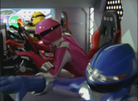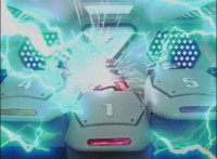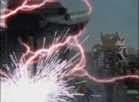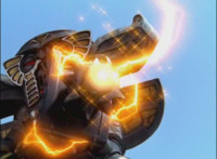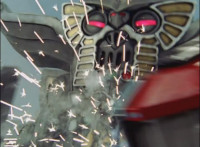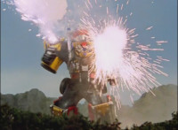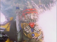 The Megazord cockpit erupts in sparks and crackling, frying the five Rangers inside of it. Flurious' Robot then charges up its bazooka with the golden energy, and fires at DriveMax Megazord, erupting sparks upon it, and bursting also within the cockpit. |
