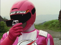 Zoom out as the Rangers land on the ground, Pink talks as she consults her Overdrive Tracker, zoom in on the forested mountains. |