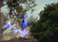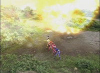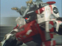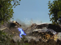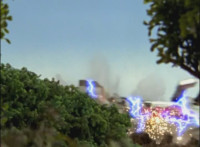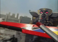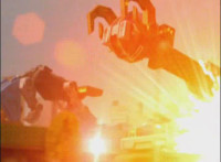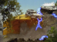 Flurious' Robot fires another blast, and the golden ball of fire smashes into DriveMax Megazord, sending the component Zords flying in all different directions, Sub Driver landing first. |
