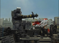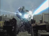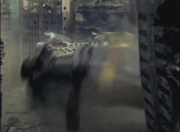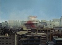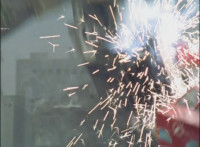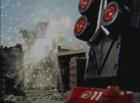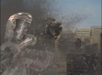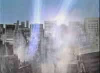 Cropped; prior shot of city being blasted from air by Robot is cut. |