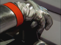 Squeezed; trimmed heavily, and remaining flames digitally erased from foreground; cuts follow-ups of more dousing of flames, including all those around Flurious' Robot. |