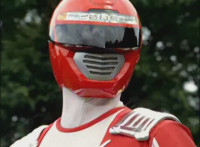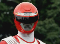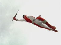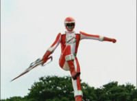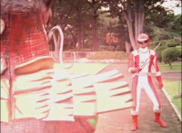 The crane crashes onto the cement, and Mack beneath it, only for him to pop up in Red Ranger form atop the smoking debris, before leaping off. |