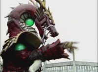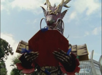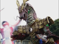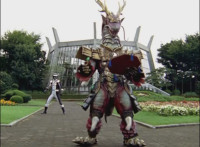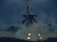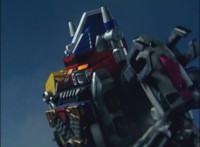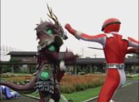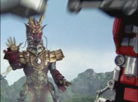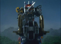 Blothgaar appears distressed, when suddenly the dark skies turn bright again. He then runs forth, slips on a rock, and plants front first on the ground. When Blothgaar looks up, Super DriveMax Megazord now stands before him! He stands back up and staggers back, as Super DriveMax readies arms. |