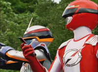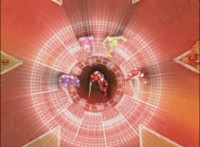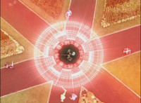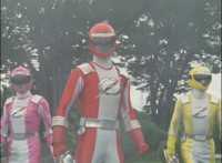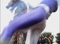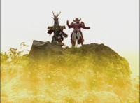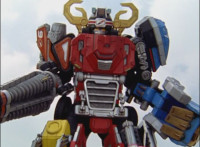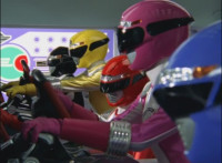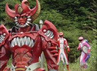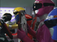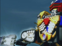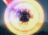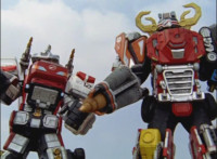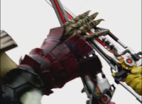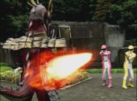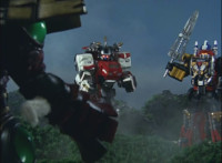 DriveMax Megazord rises up in the near distance, zoom in on Pink pointing with the compass, as a four pointed compass appear on the screen, denoting each Zord is in a position matching East, West, South, and North around Blothgaar. Pink lowers the compass, talks, then points, Blothgaar reacting. Pink hands the compass over to Red, who twirls it, then works the controls. DriveMax Megazord charges up its saber, creates an energy seal, then slashes into it, sending it flying into the monster, enchanting him. Red speaks, then zoom out as Flashpoint Megazords joins DriveMax in facing Blothgaar. |