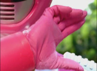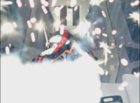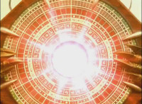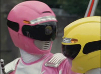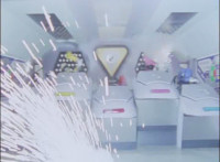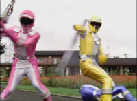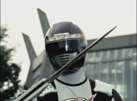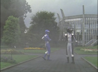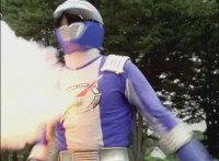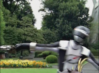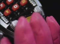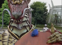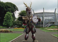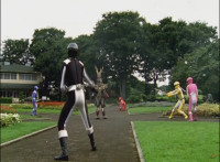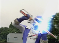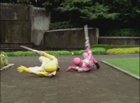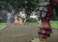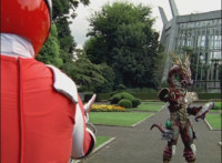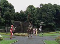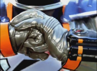 Red makes another strike or two at Blothgaar, who blocks, talks, then sparkily strikes Red into flying off. With Rangers at each direction of him, Blothgaar addresses those surrounding him, turning around to do so, before pulling out the large compass he's been carrying this whole time, to gesture over its center gem, causing it to flash, which glows into a seal around him, which apparently charms him. Red reacts, Blothgaar speaks and spins around, Yellow & Pink react, with the latter firing her Blaster at Blothgaar, each bolt missing him and striking sparkily before Blue! Pink ceases firing as Yellow stops her, the Rangers all react, Blothgaar then fires a bluish energy bolt at Blue, who blocks it with his Saber, flings it away, it bounces off a window back at him, and bursts him in the chest. Track past Blue's downed body toward Blothgaar turning 360 as he talks to the Rangers. Red & Black react, and quickly race forth to attack him at the same time, but Blothgaar spots something on the ground, ducks down to pick it up, avoiding Black's slash. |