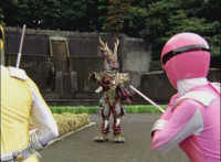 Red leaps up forth with his Drive Saber ready, lands with a jab at Blothgaar, who dodges, then sparkily strikes Red away, does the same to Black, then faces Blue, smacking him down. Blue rolls over to Pink & Yellow, readying their blades. Blothgaar reacts excitedly to this challenge, speeding over in a blur to block both their weapons, then flip them over. |