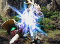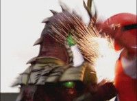 Blothgaar punches sparkily into Red, sending him flying, and where he lands his teammates regroup. Blothgaar readies the compass, Red recovers, aiming his saber at the monster, who responds by pointing at him. |
