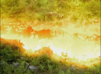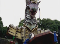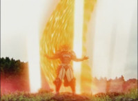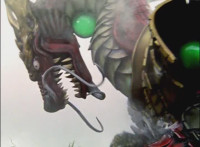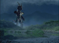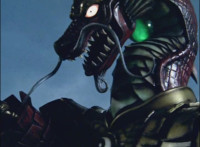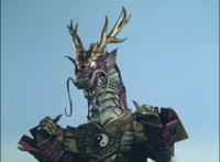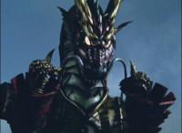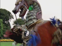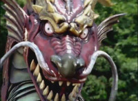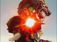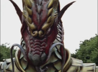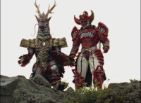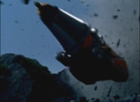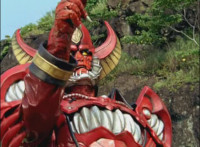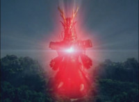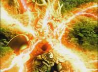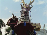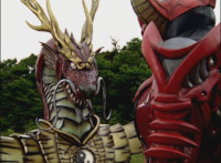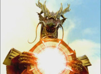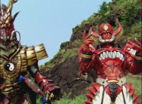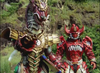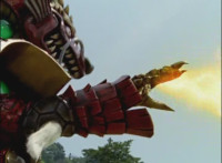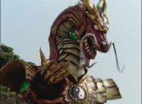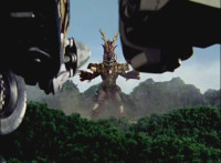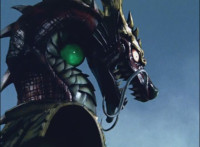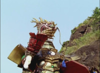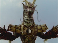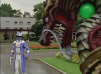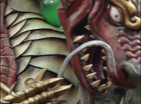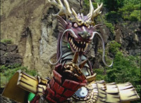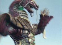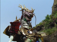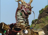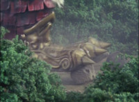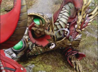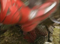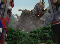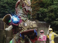 Blothgaar, body smoking, slowly climbs along the cliff's edge, heading for the golden light of the fissure below. Moltor approaches him, talking. Blothgaar replies pitifully, Moltor responds, then kicks him over the edge into the golden light of the fissure! The earth quakes around Moltor, as the Rangers appear behind him. He turns to face them and talk, zoom out as suddenly a golden snake dragon rises up from the fissure and forms in a flash into the now-giant Blothgaar. The Rangers react, then Mercury & Red pull out their Morphers and summon. |