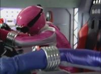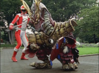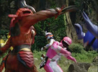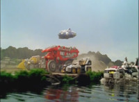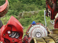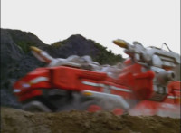 Blothgaar turns and gestures to a river, then over to mountains, taunting them to attack. Pink pulls out the compass, Blothgaar looks ready, Pink nod-talks, spins her Overdrive Tracker's turbo wheel, and suddenly the four auxiliary Zords leap out of the ground. Drill Zord smashes into Blothgaar on the way by as the four Zords take directional positions to the monster. |
