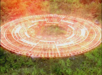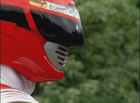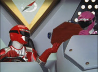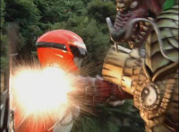 Blothgaar talks and gestures to Red, who lowers his guard, as the monster aims the compass at him, it glows, the seal glows around him and the Rangers, fading into Red particularly. He reacts, as Blothgaar talks and motions to the compass. Red responds, Blothgaar waves him away, then fires eyeblasts at the team, sparking in front of them. Blue & Black rush through the smoke, only to find Blothgaar long gone. Push in on Red, appearing concerned for what has happened. |