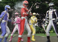 The five Rangers nod-talk in 5 split screen of them in their cockpits. |