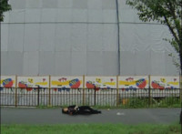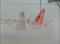 Mack lies on the ground, as we pan up to see a crane breaking off of a tower and plummeting down. |