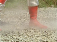 Close on Red's boots skidding to a stop in the gravel, as Blothgaar crackles and spark bursts. |