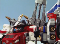 Flashpoint & Super DriveMax Megazords pose triumphantly as camera circles around under them. |