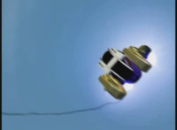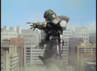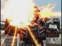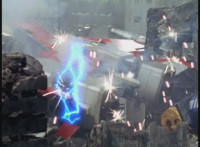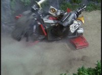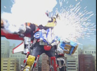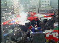 Fearcats work the controls, as Robot II speed leaps skyward, avoiding the fiery swath of energy. The Rangers look puzzled, when suddenly DriveMax Ultrazord turns to see Robot II behind it, floating in the sky. Mig pulls the lever, Robot II switches to a double leg kick position, and lands in the back of the Ultrazord explosively, crackling the Rangers in the cockpit, sending Ultrazord soaring downward into the city, crash landing. |