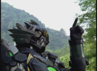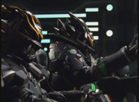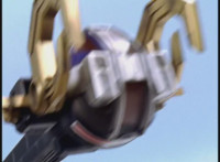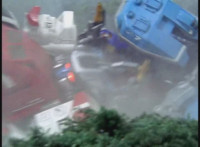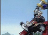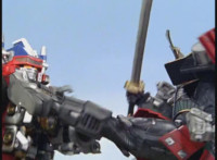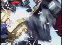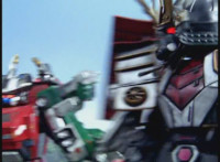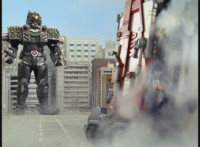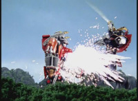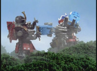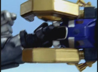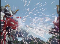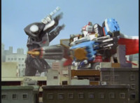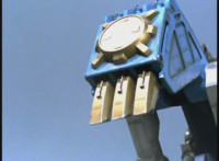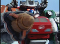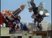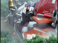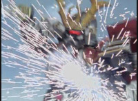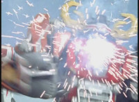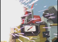 Cropped; trims shot 2 heavily, cutting Robot II ducking a Drill swipe and blocking a Shovel slash from the Ultrazord; cuts follow-up close-up of Ultrazord reacting. |