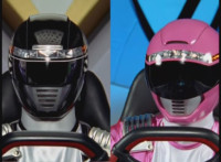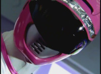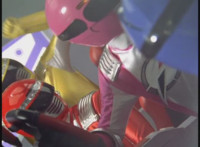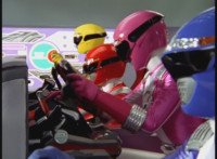 The Rangers, particulary Pink, turn around in their smokey cockpit. |