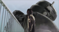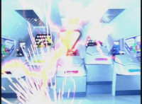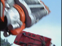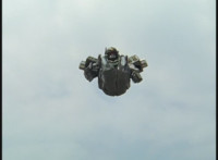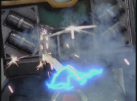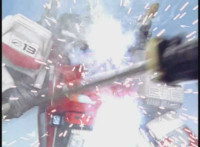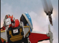 Cropped; cuts follow-up of Fearcats talking in cockpit, then firing on the Ultrazord, which swoops out of the way of lasers, but gets hit by missiles, shaking up the Rangers, until thrusters are ignited. |