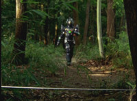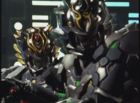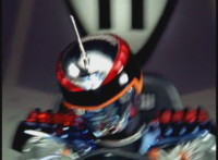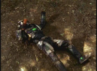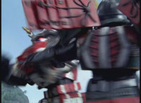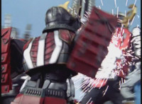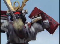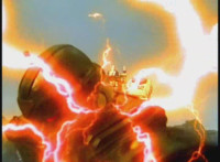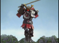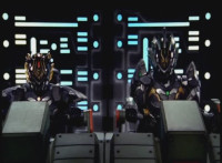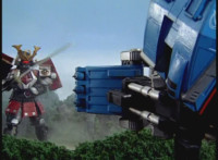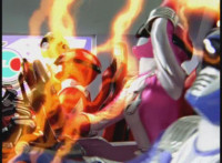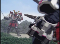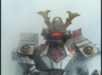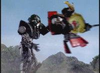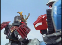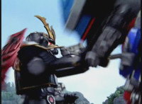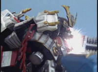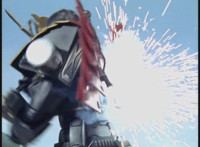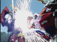 Robot II leaps off the ground, prepares sword, sparkily slashes Flashpoint, does the same to Super DriveMax, before turning and doing it again to the latter, so Flashpoint steps in and punches the sword, which sparks but nothing else. Robot II sparkily slashes Flashpoint thrice, shaking up Mercury within. Armored Robot II, now against a samurai styled moon background, energy slashes vertically and horizontally, striking both Megazords. The cockpits crackle and burst, before both collapse to the ground. The Rangers are shaken up inside Super DriveMax. |