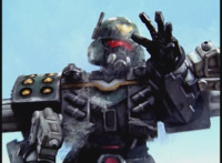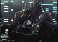 Black & Pink are shaken up in their cockpits. Armored Robot II is suddenly confronted from behind by Flashpoint jabbing its Drill arm forth. |