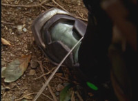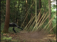 Mig strolls down a forest path, when he suddenly stops, having touched a tripline with his ankle. He looks down, and quickly spins out of the way as wooden arrows shoot down on the path, narrowly avoiding them. |
