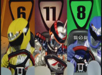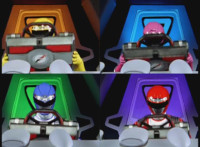 Zoom in over the downed Megazords as armored Robot II poses. Mercury straightens his steering wheel. The Rangers in Super DriveMax talk and appear generally disorganized, until Black stands up. The Rangers, Mercury included, all look to him. He talks a bit, then the Rangers process this dialogue and talk a little, before he sits down. Each Ranger gets a quick close-up, then push in slowly on Black as he talks. |