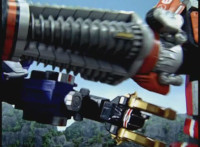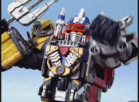 DriveMax Ultrazord readies Drill arm and goes to strike, but the Robot II grabs the arm, holding the Ultrazord in place. |