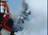 Armored Robot II crouches suddenly, ducking under the Drill arm of Flashpoint. Mercury looks downward, as Robot II suddenly springs back up, sparkily slashing the Megazord as it does, causing it to topple over, shaking up the three Rangers within. As Flashpoint lies on its back, Robot II approaches. Mig gives a hand gesture, Robot II raises its sword to strike, when suddenly the Crane head flies through the air. The Fearcats react, as the Crane head snags the Robot's sword. Red talks in his cockpit, Mercury responds from his. Flashpoint unloads its water cannons up at Robot II, sending it staggering away. DriveMax with Crane arm yanks on the rope, sending Robot II toppling over, shaking up the Fearcats within. Flashpoint stands back up and walks. DriveMax reels in its Crane fist, then joins Flashpoint in marching right at Robot II as it stands back up, and gets struck from both sides by each Megazord simultaneously. However, Robot II blocks both the Drill and Crane attacks at the same time! |