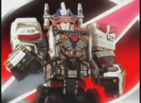 The Fearcats Robot II readies arm cannons to fire upon the city before it, when suddenly the DriveMax Ultrazord flies in with its leg poised in a kick position, striking sparkily against the Robot, knocking it back several feet. |