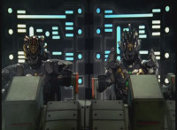 The Fearcats' second Robot, one with a commando design, stands bent at the knee, in a hangar, as camera circles around under it. Inside the cockpit, Mig stands there talking, before sitting down and talking more, pan over to Benglo also talking. Both pull down their control levers, causing the Robot's visor to illuminate with a red glow. |