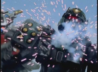 Fearcats speak, then Robot II swings the Ultrazord around and shoves it away. Given enough distance, Mig hits the controls and Robot II fires arm cannons forth, sparkily bursting Ultrazord, shaking up the four Rangers in the cockpit. |