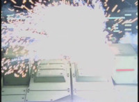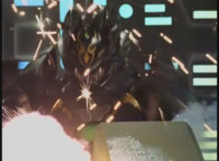 Cropped; cuts follow-ups of Flashpoint sparkily striking Robot II a few times, then pushing it back, Mercury talking, jabbing Drill again, and Mig responding. |