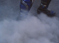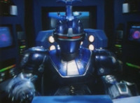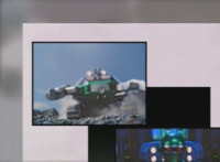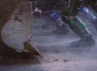 A side shot of the legs of the BeetleBorgs as they're pushed back by the bulldozer, then Noxic talks. |