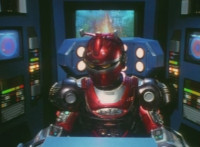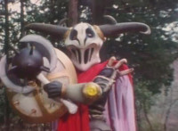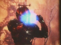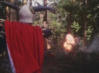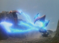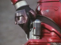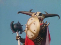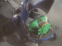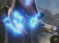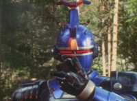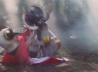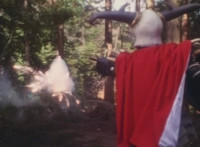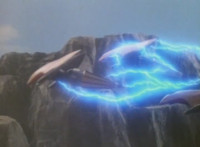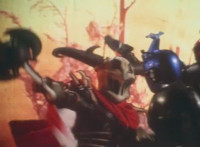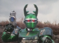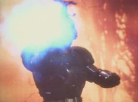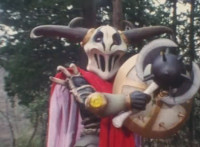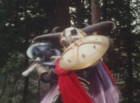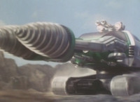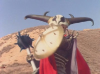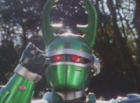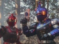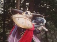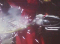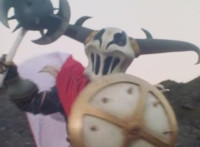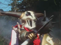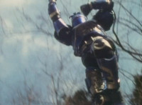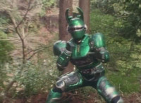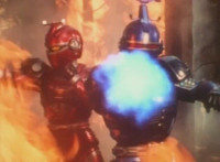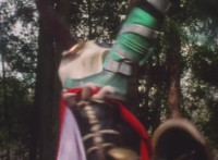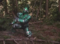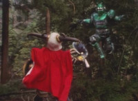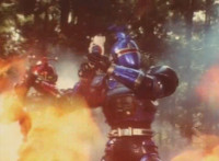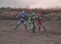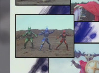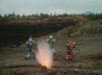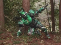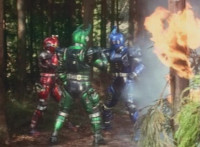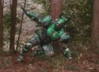 Mace Warrior leaps forth, Green jumpkicks into him, but he blocks with his shield, sending Green falling into the forest. There, Mace Warrior charges up his mace and fires an energy blast at the Borg, who dodges by diving out of the way, causing the tree behind him to burst. A pair of trees fall toppel over around Green, who avoids getting crushed. Mace Warrior tosses another energy blast from his mace, and again Green dives out of the way, the tree takes the hit, and two more trees fall over. Green rolls out of the way, and back up to pose, before leaping up, bounding off Mace Warrior's shoulder, and regrouping with his teammates in the quarry. Mace Warrior races after him in dramatic slow motion, so the Borgs unholster their Sonic Lasers, Green leading the way as they all fire on Mace Warrior, who pauses against the beam bombardment, only to soon block them all with his shield, reflecting them down into a trio of fire bursts that erupt before the Borgs, stunning them. |