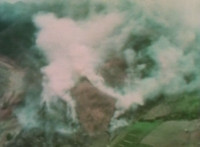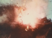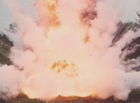 Massive explosion erupts against the side of a mountain, spewing dirt and sparks from it. A forest ignites with flames. |