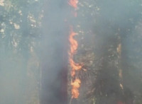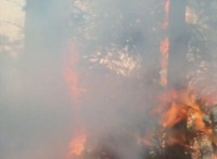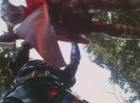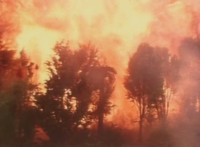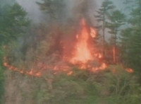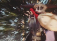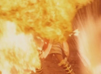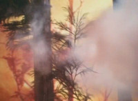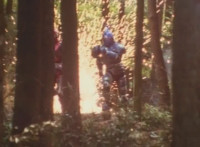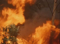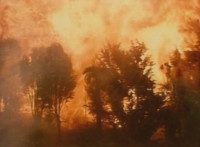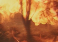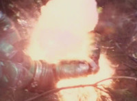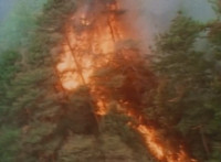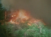 Red & Blue race through the forest along a path as sparks erupt before them. Suddenly, stock footage of a real forest fire appears. |