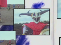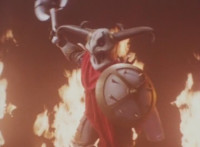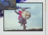 As he and Red prepare to fire their Sonic Lasers at the fire, suddenly Blue looks up as Mace Warrior leaps in, striking with his mace, only for Blue to block the attack and flip the monster over, . |