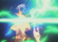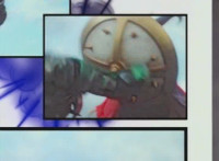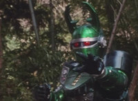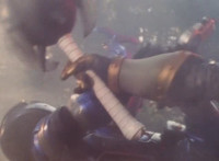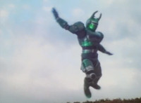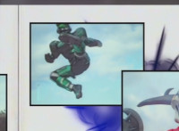 Green materializes his Hunter Claw, then pulls it out, causing the misty dark area around him to set ablaze. Mace Warrior races at him, so Green does the same to meet him in the middle, they clash weapons, then the monster blocks, before jabbing his mace forth, only for Green to sparkily snatch his waist with his Hunter Claw. In agony, Mace Warrior drops his mace and shield in the mist. Green then hoists him up in the air by the Claw, then spins the Claw blade, causing Mace Warrior to twirl around overhead, then tosses him away, where he rolls ablaze, losing his shash. Green charges up his Hunter Claw with green energy, then slashes it across, striking Mace Warrior, who crackles then dissolves into just a flying head. |