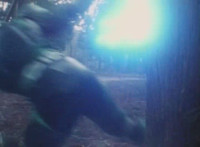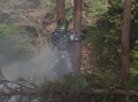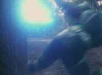 Green falls into forest. Mace Warrior tosses energy maces at him, he dodges, missing the tree burst. |