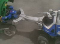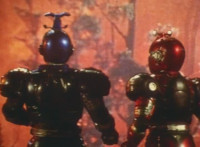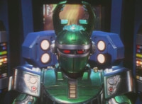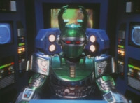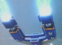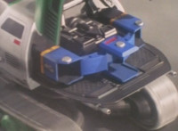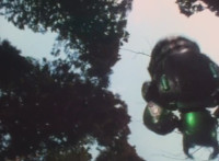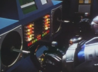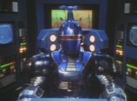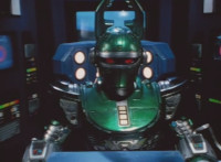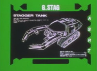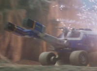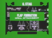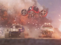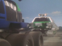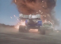 As a forest fire rages on the monitor behind him, zoom in on Green. Suddenly, we see schematics for the next phase of their AVs. Green nod-talks some more. Stinger AV rolls ahead away from blasts on the horizon, then opens up its trunk, revealing a drill attachment inside. Hunter AV rolls up behind it, snags the drills with its pincher, Green nod-talks again. Hunter AV now has its drill attachments on, as it opens up its own trunk to reveal the magnet attachment, which Stinger snags with its antenna. Blue nod-talks, before explosions erupt around the magnet-attached Stinger AV. |