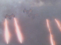 A trio of Magnavore Jet Fighters fires lasers while swooping in to our left amid acrid smoke. |