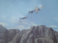 Three Magnavore Jet Fighters swoop down and fire lasers to our left while strafing just above the surface of the desolate landscape. |