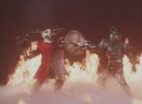 Amid flames, Blue raises a fist, pan over to Red as she does as well, then both reach for their Sonic Lasers. |