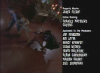Trims start with a freeze-frame to remove initial pose; altered to fit comic panel; cuts follow-ups of more posing from the three, then walking and fighting Scabs in a lengthy sequence. |