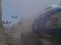 Three Magnavore Jet Fighters swoop down and fire lasers to our right while strafing just above the surface of the desolate landscape. |