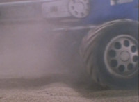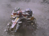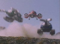 The three Beetle AVs, along with Gargantis, plod along the outskirts of town. A downward angle of the three Beetle AVs racing along in tight formation. Blue nod-talks, then raises his Pulsaber, the LED lights on which light up fully in a close-up. |
